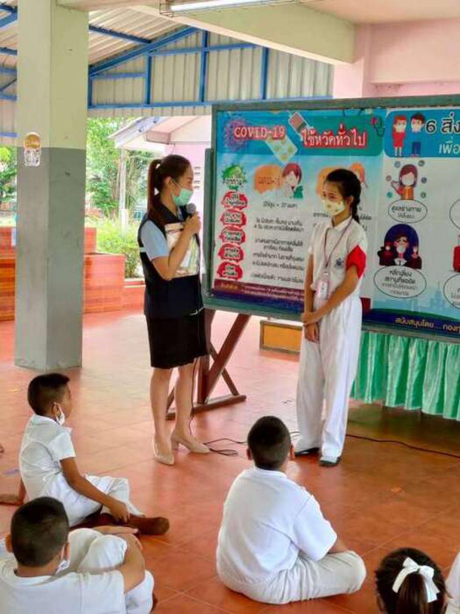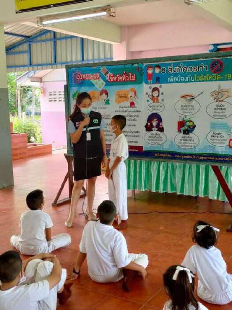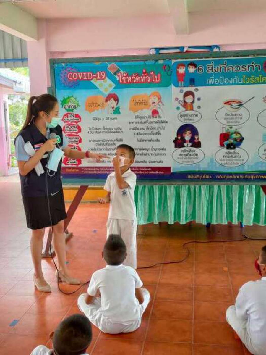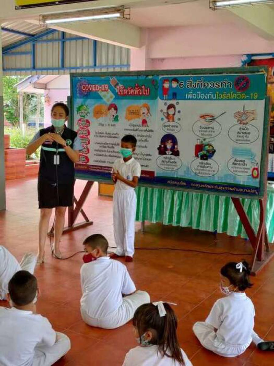 เจ้าหน้าสาธารณสุขตำบลบางปลาให้ความรู้เกี่ยวกับ covid-19