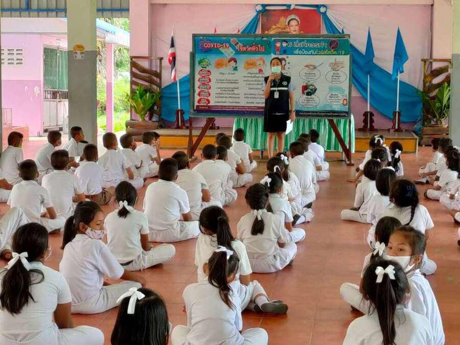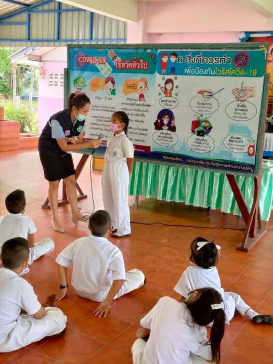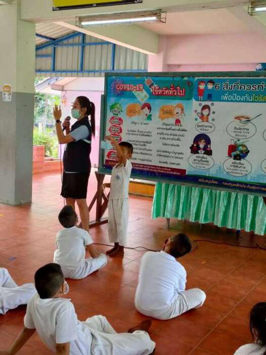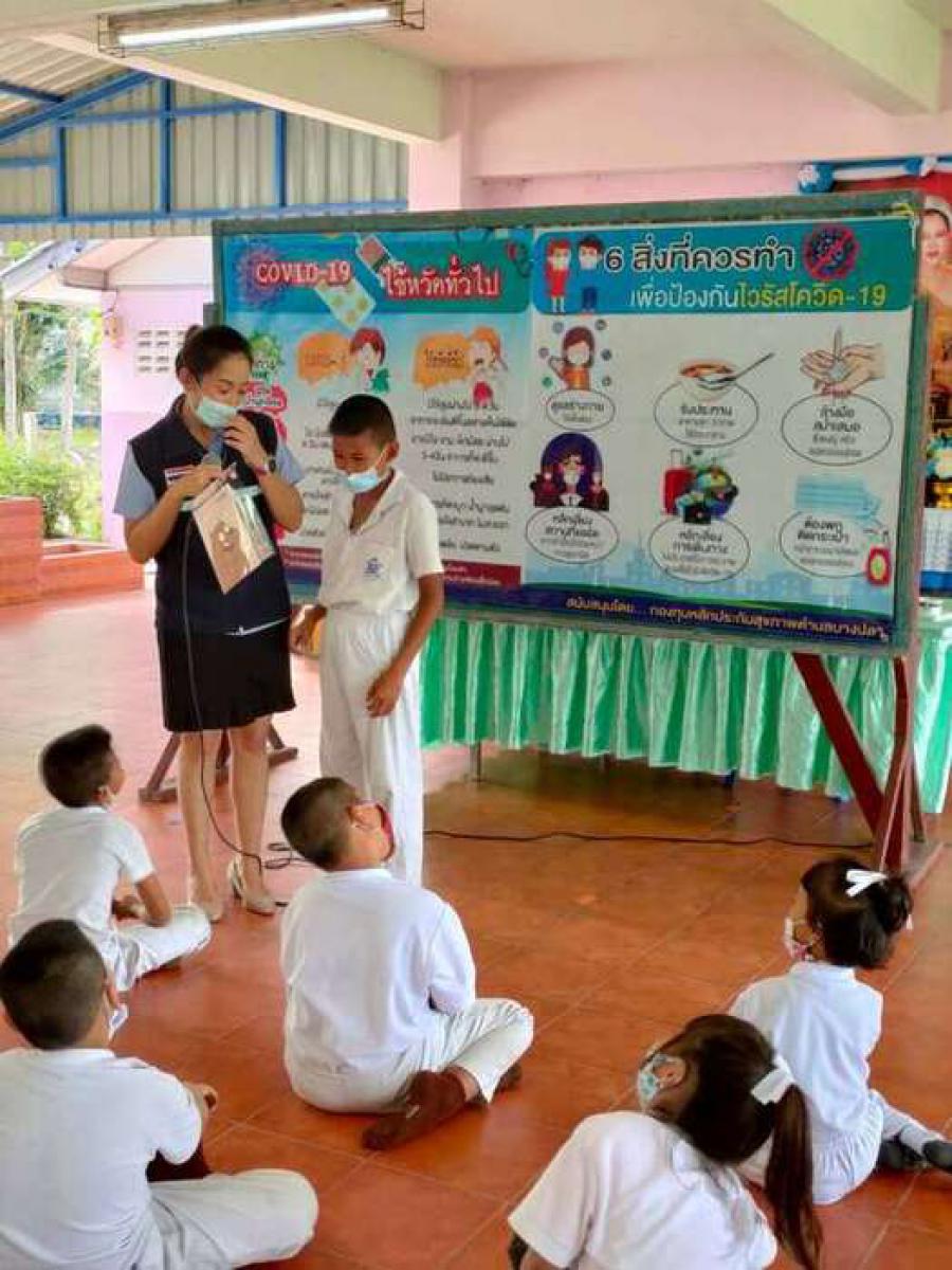 เจ้าหน้าสาธารณสุขตำบลบางปลาให้ความรู้เกี่ยวกับ covid-19
