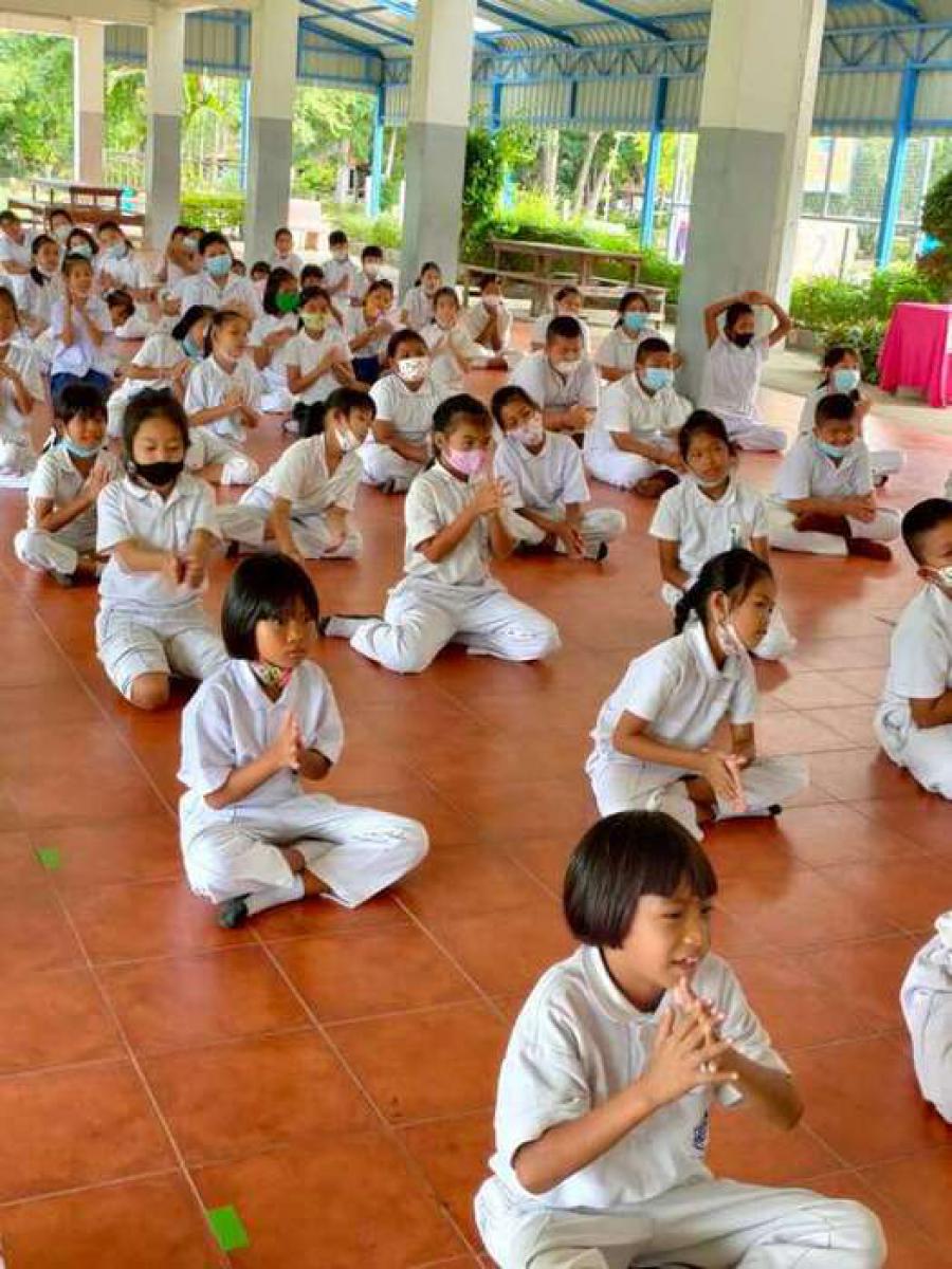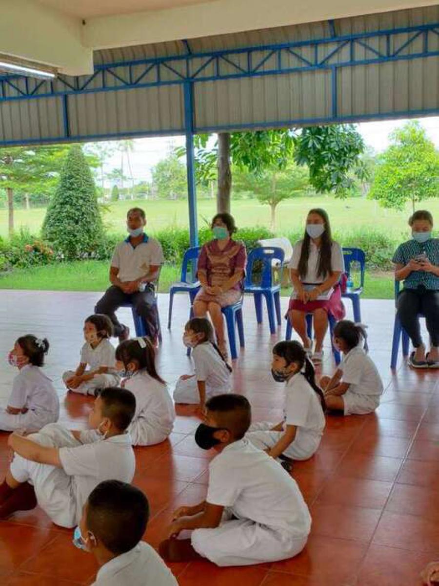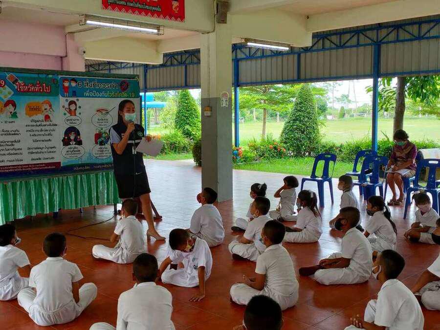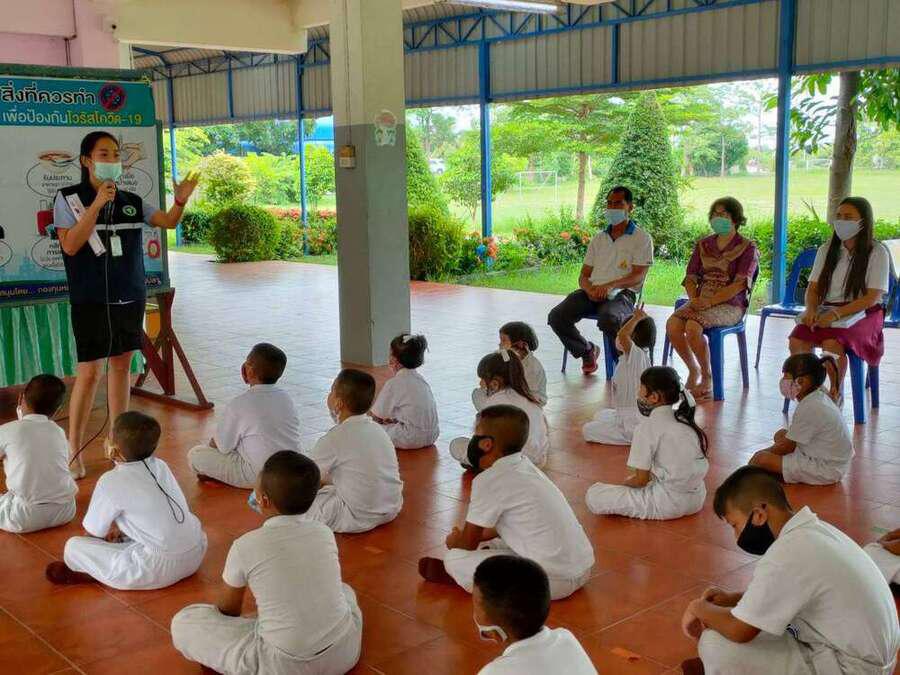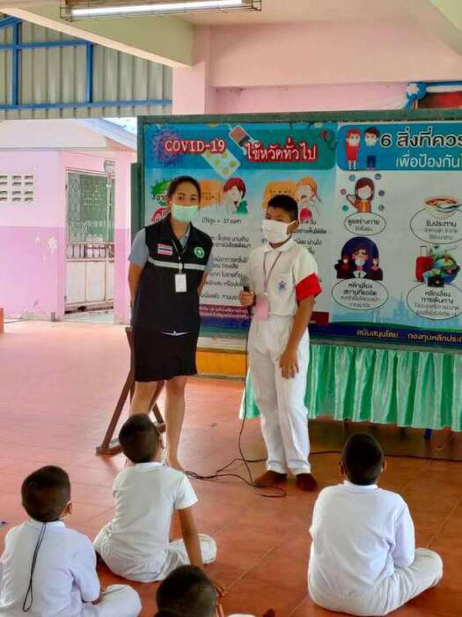 เจ้าหน้าสาธารณสุขตำบลบางปลาให้ความรู้เกี่ยวกับ covid-19